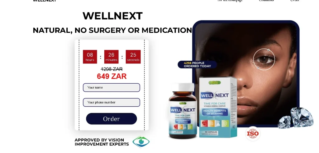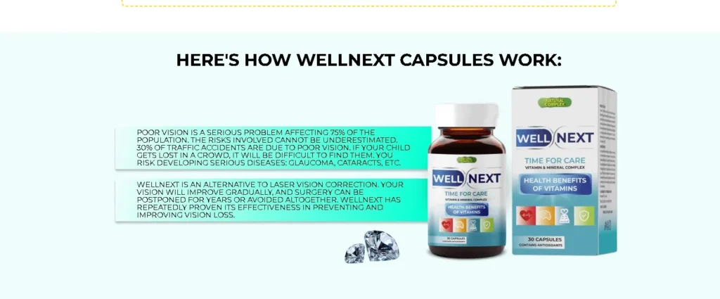 Wellnext was developed as a natural daily-support supplement designed to help protect the visual system, reduce eye fatigue, and support metabolic processes related to eye health. Its formula combines plant-based ingredients, essential vitamins, and minerals that work together to support visual comfort and long-term eye protection.